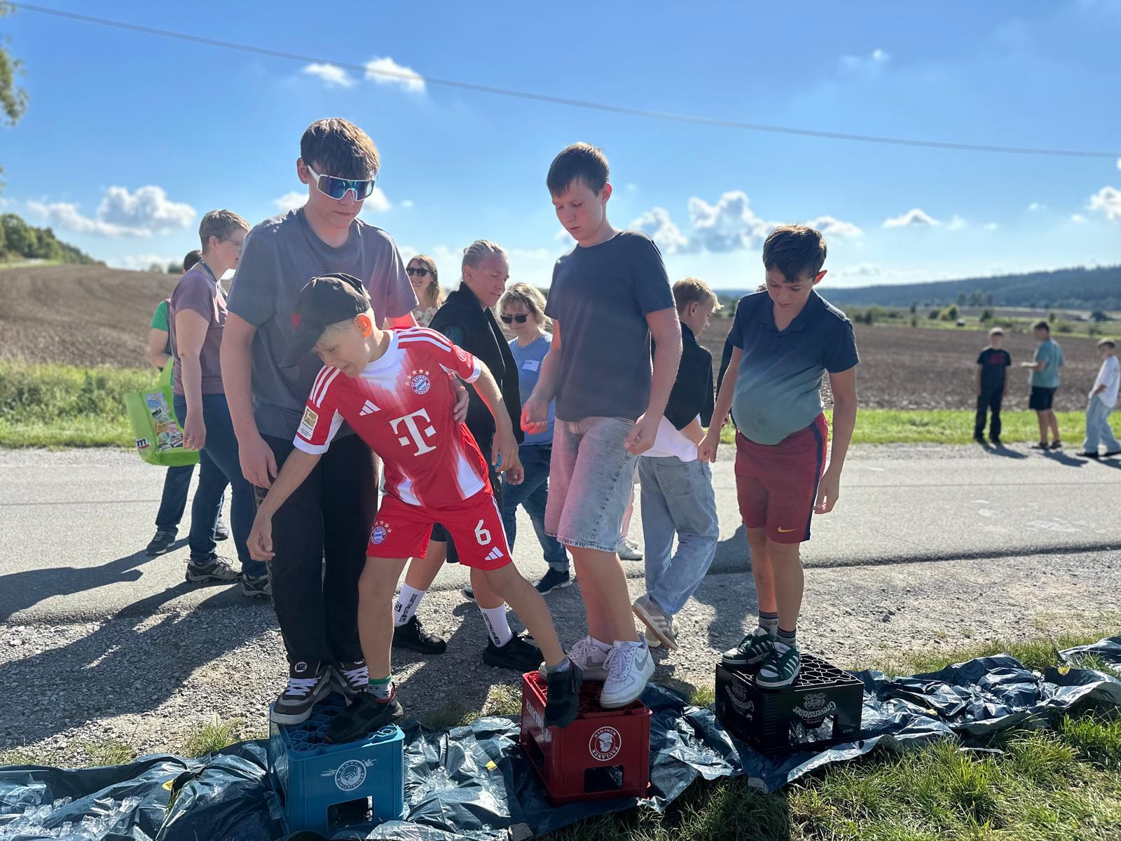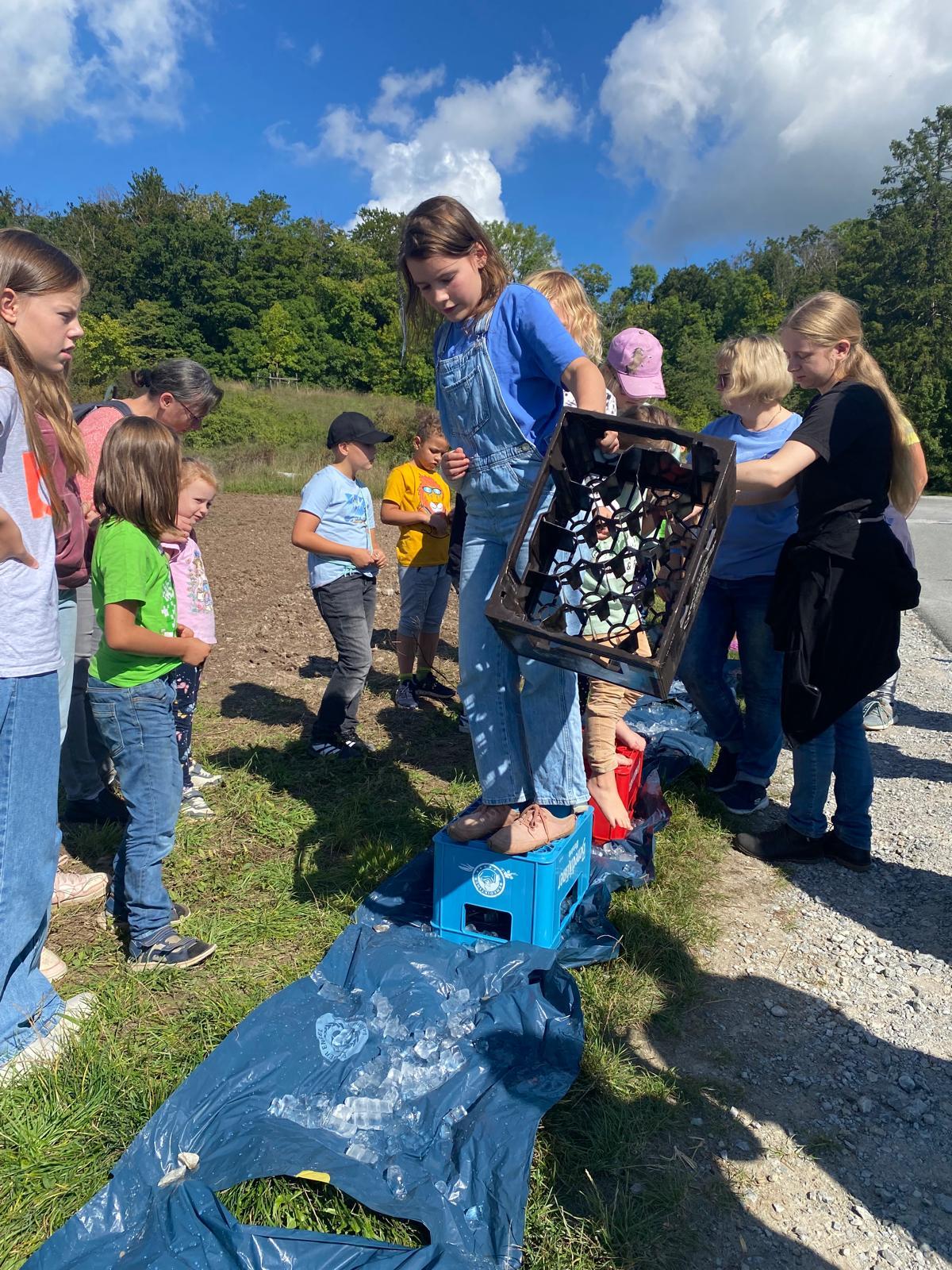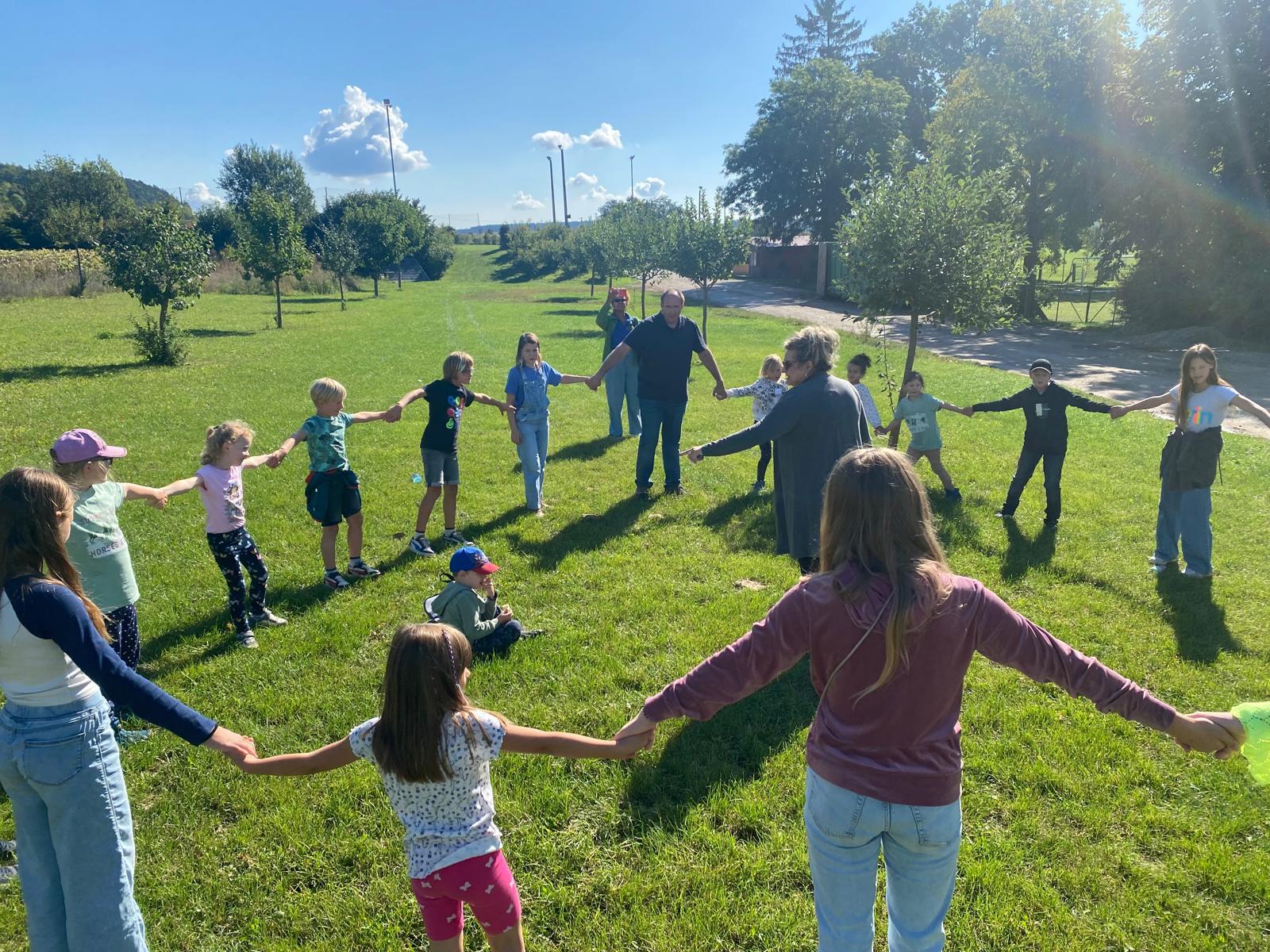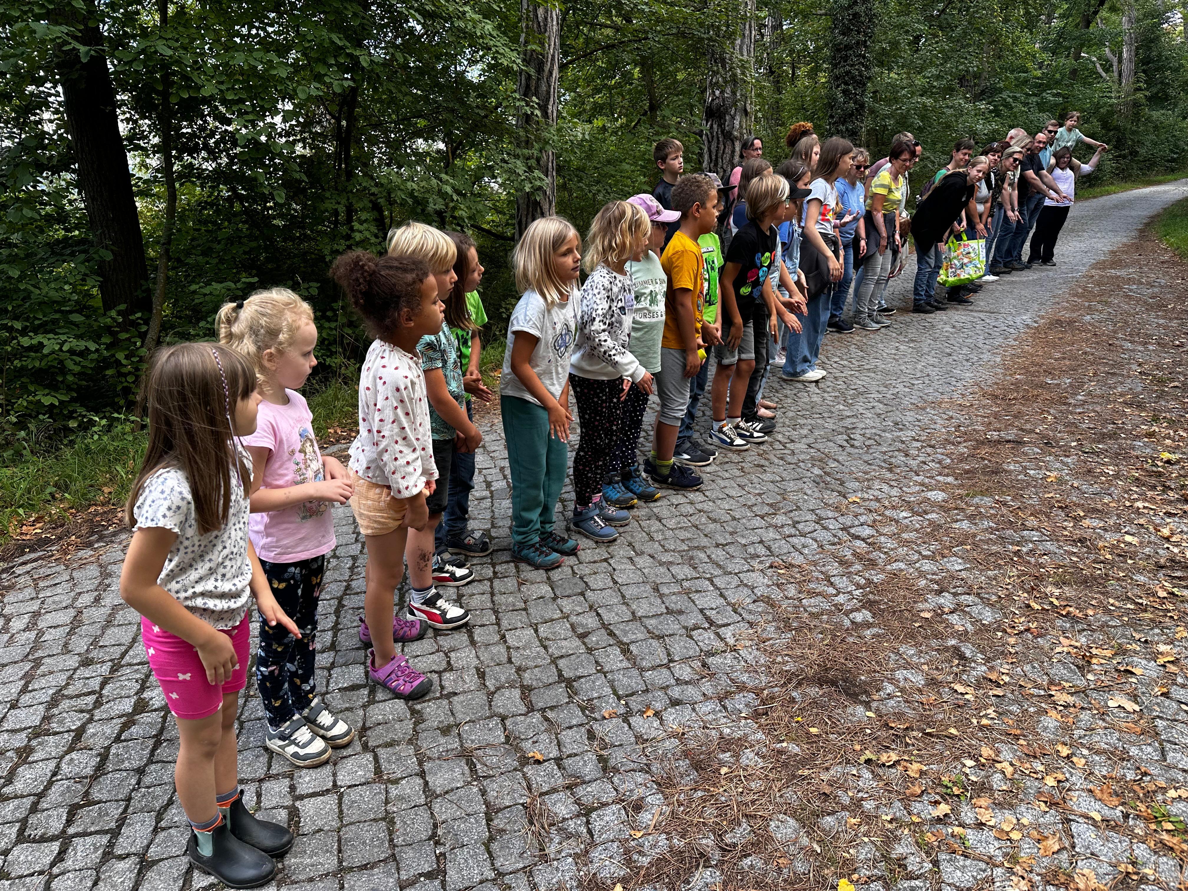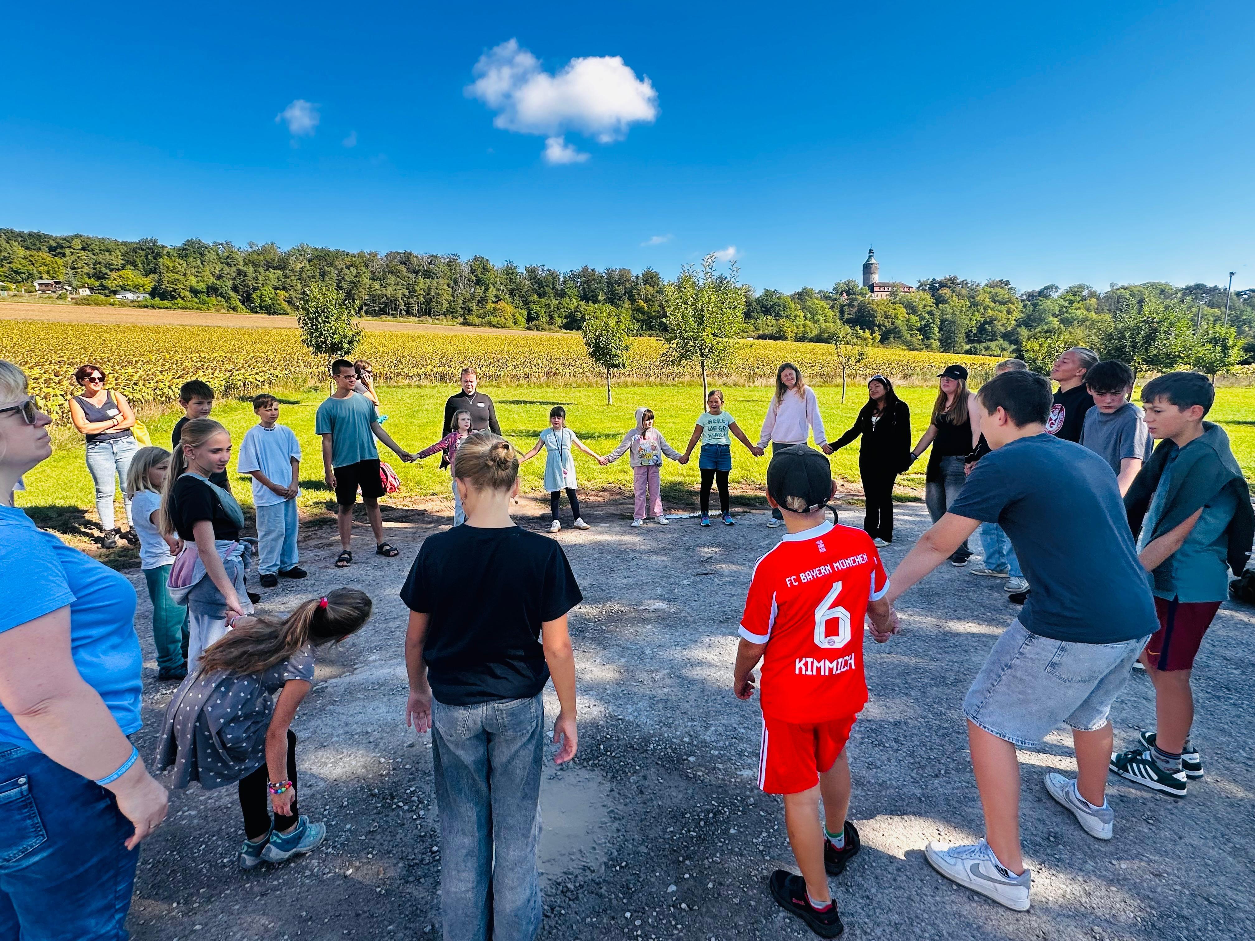 Nachdem auch die Tagesgäste am Schullandheim angekommen waren, begannen wir den Tag mit einem gemeinsamen Gebet. Anschließend brachen die Kinder in zwei Gruppen zu einer „Schöpfungswanderung“ auf.