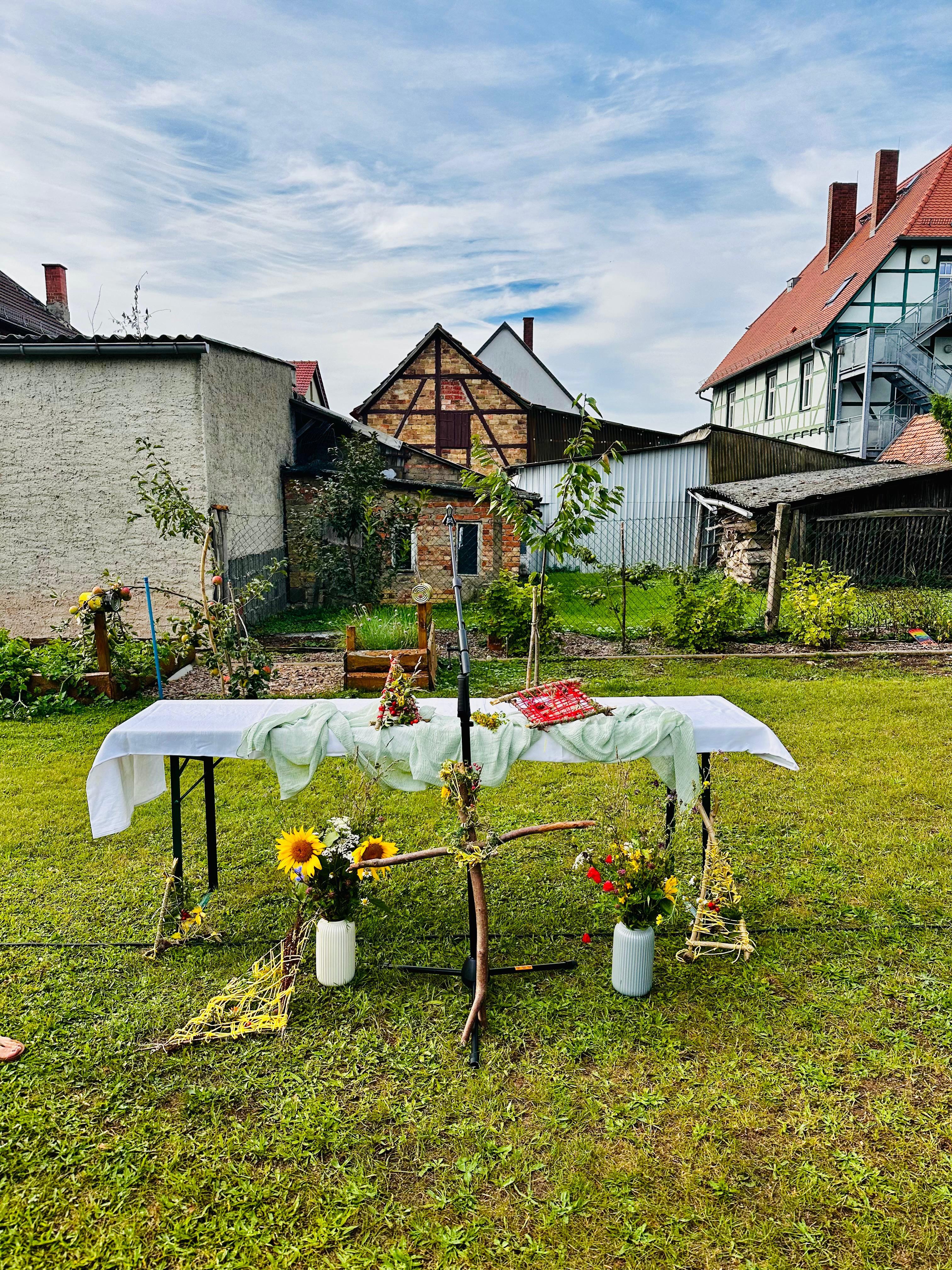 Der Altar wurde auf der Wiese aufgebaut und Bänke gestellt. Die Kinder durften auf Picknickdecken in der ersten Reihe Platz nehmen.