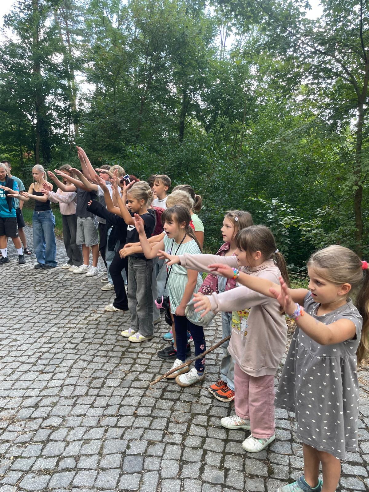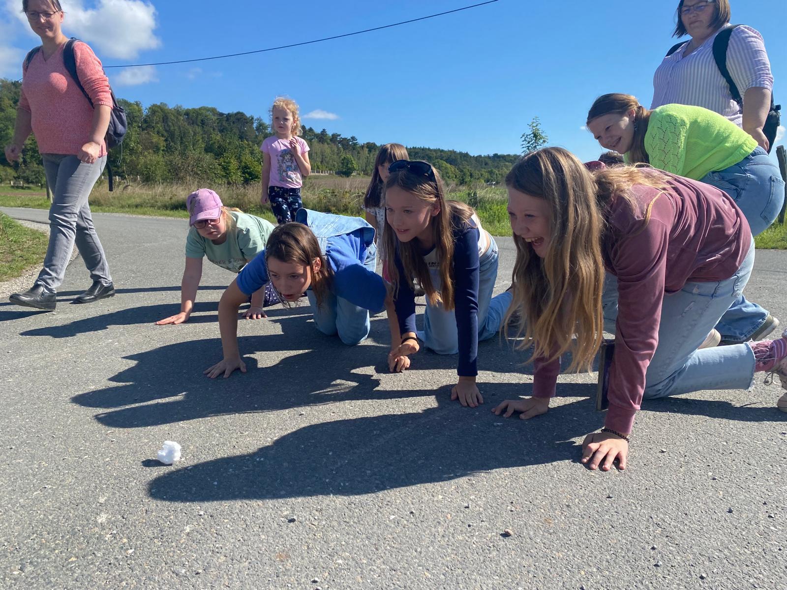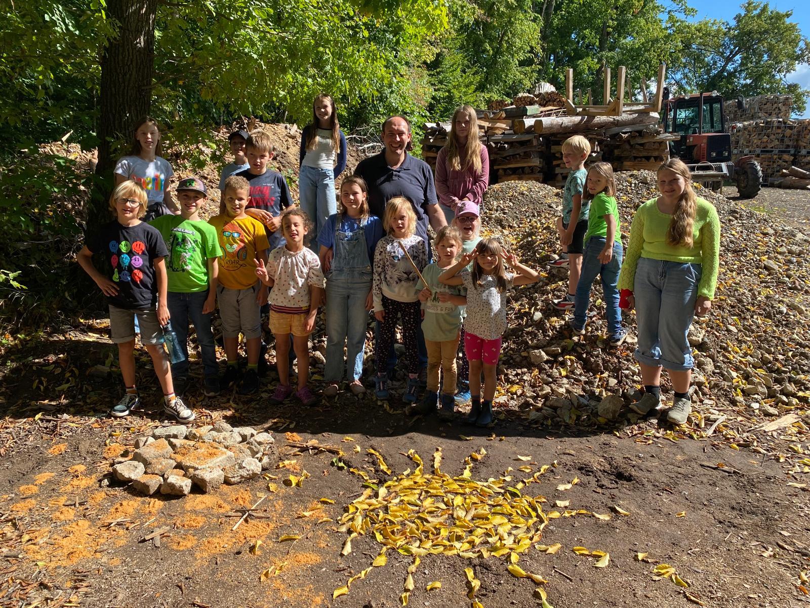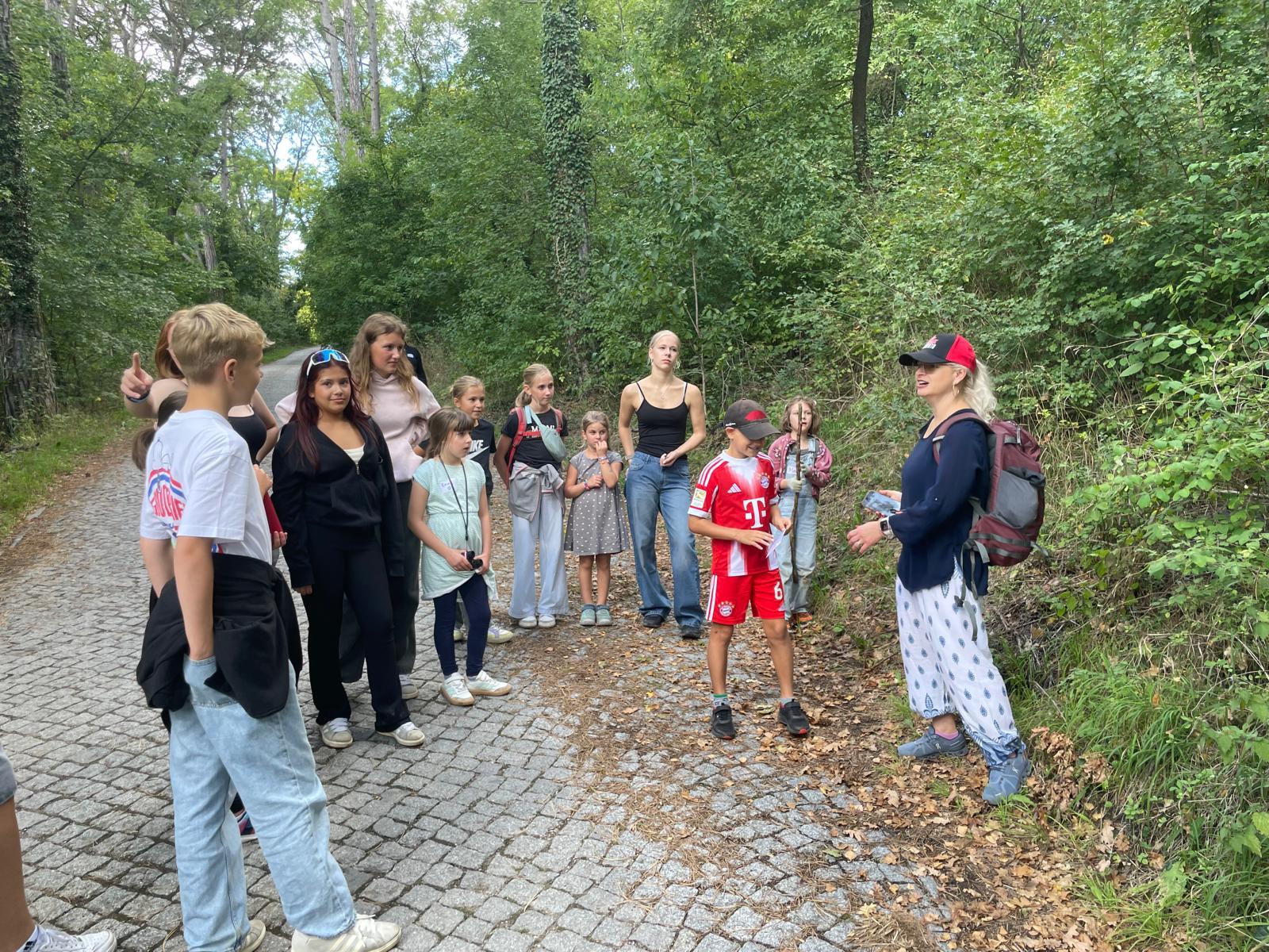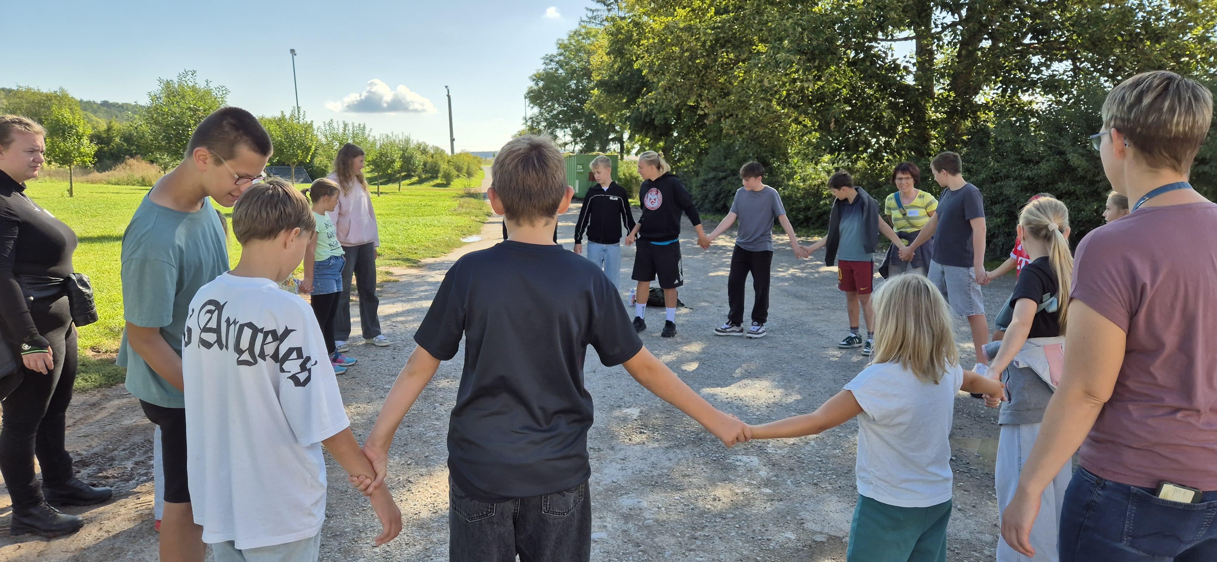 Nachdem auch die Tagesgäste am Schullandheim angekommen waren, begannen wir den Tag mit einem gemeinsamen Gebet. Anschließend brachen die Kinder in zwei Gruppen zu einer „Schöpfungswanderung“ auf.