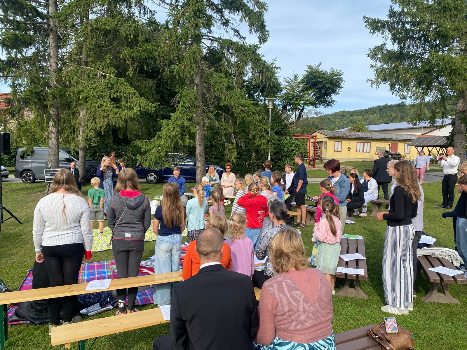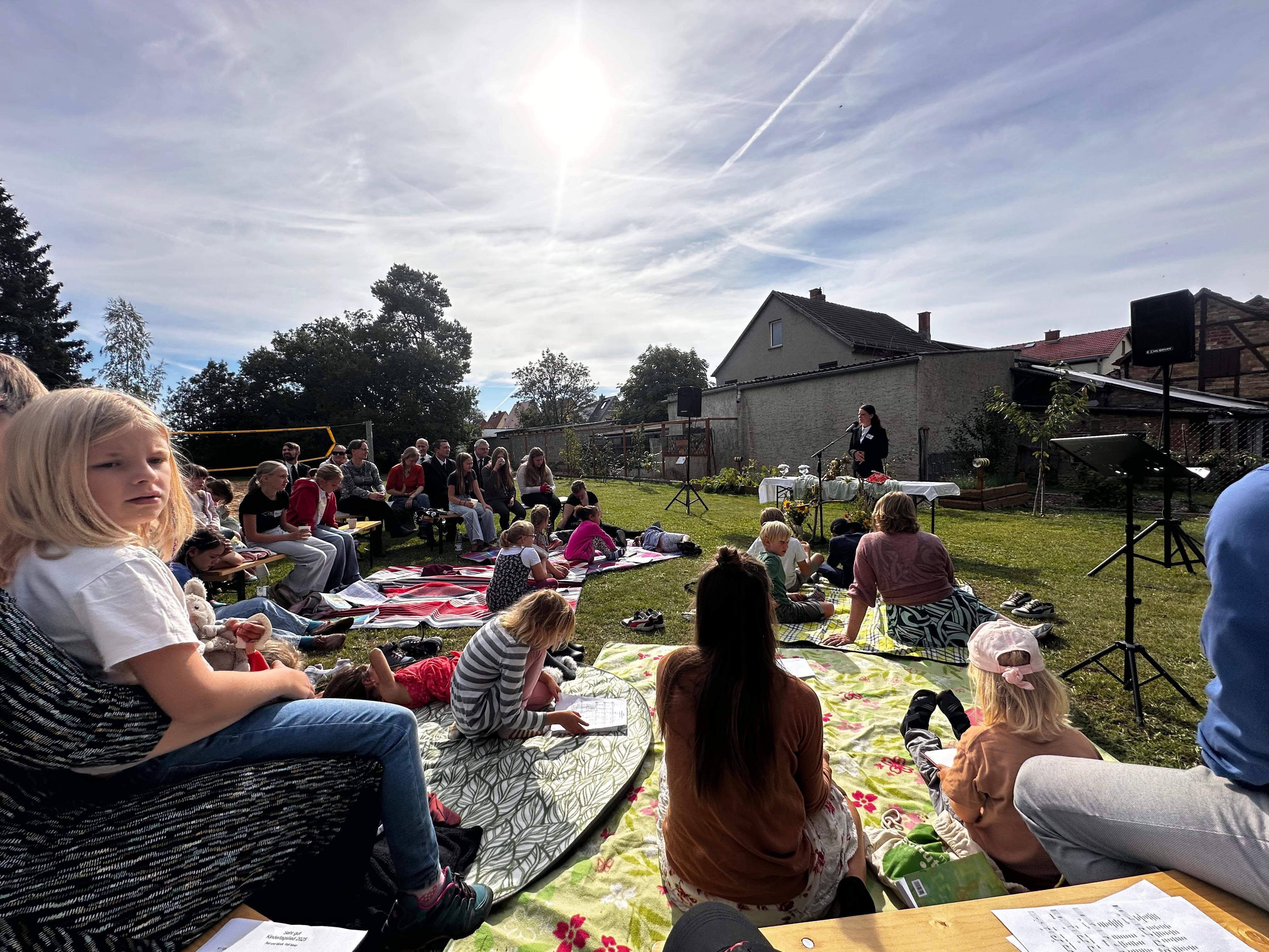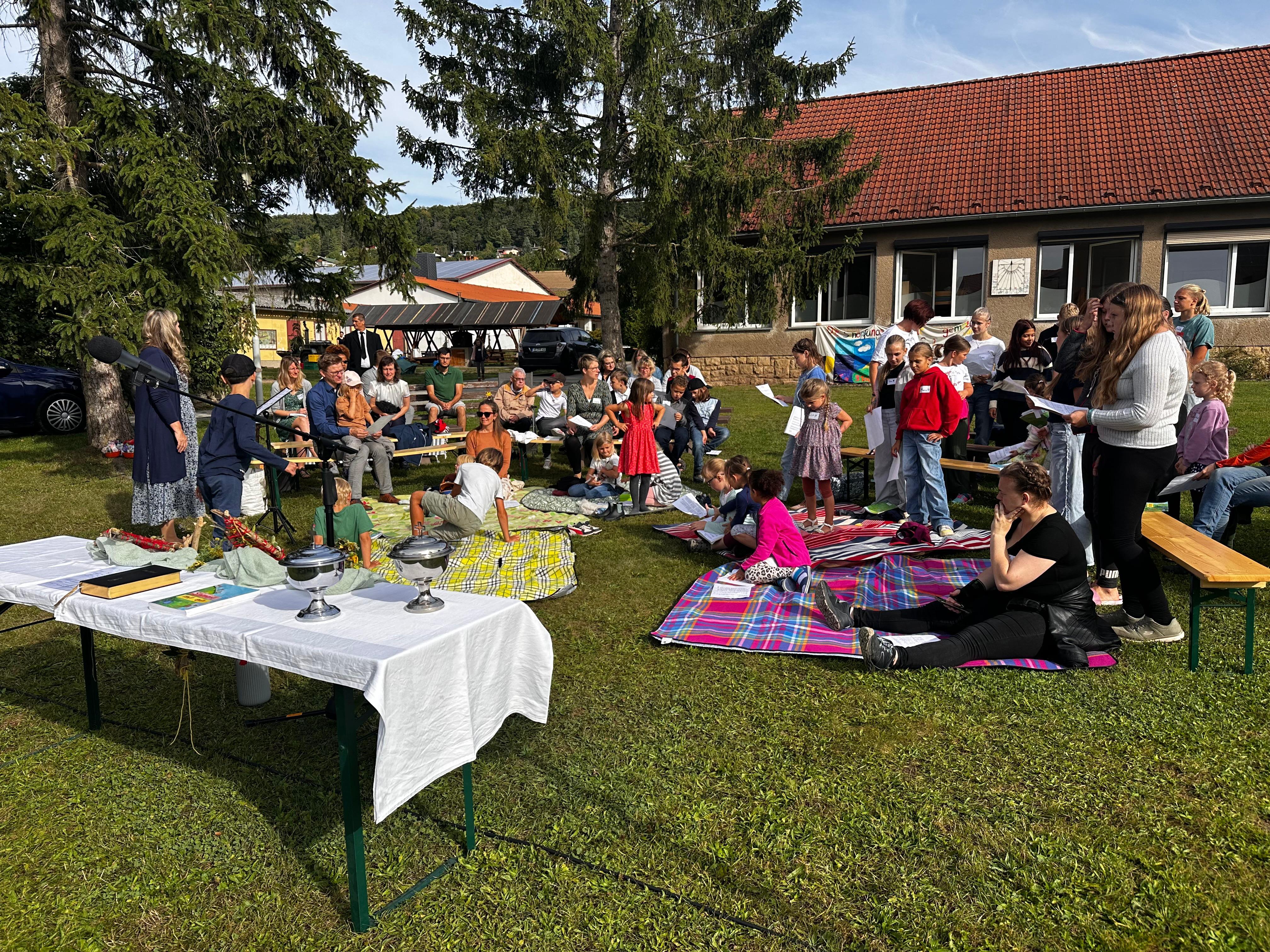 Der Altar wurde auf der Wiese aufgebaut und Bänke gestellt. Die Kinder durften auf Picknickdecken in der ersten Reihe Platz nehmen.